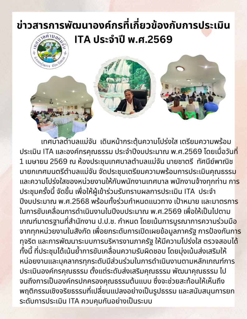 เว็บไซต์เทศบาลตำบลแม่จัน อำเภออุ้มผาง จังหวัดตาก ชื่อเว็บไซต์ {Maechan-taklocle.go.th} มีการใช้งานเทคโนโลยีคุกกี้ หรือ เทคโนโลยีอื่นที่มีลักษณะใกล้เคียงกันกับคุกกี้ บนเว็บไซต์ของเรา โปรดศึกษา นโยบายการใช้คุกกี้ และ นโยบายความเป็นส่วนตัวของข้อมูล ก่อนใช้บริการเว็บไซต์ ได้ที่ลิงค์ด้านล่าง